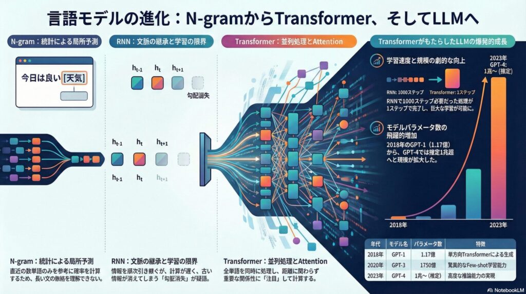 この記事では、言語モデルの本質から、N-gram、RNN、Transformerへの進化を解説しました。