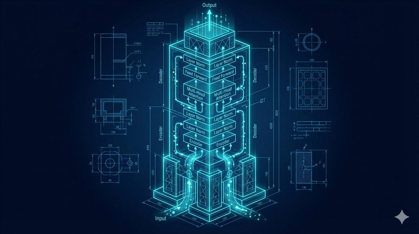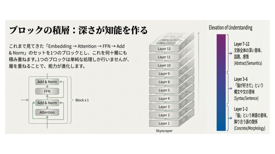 Transformerは、上述の「Embedding → Attention → FFN → Add & Norm」というブロックを、何十層も積み重ねることで、より複雑な言語理解を実現します。