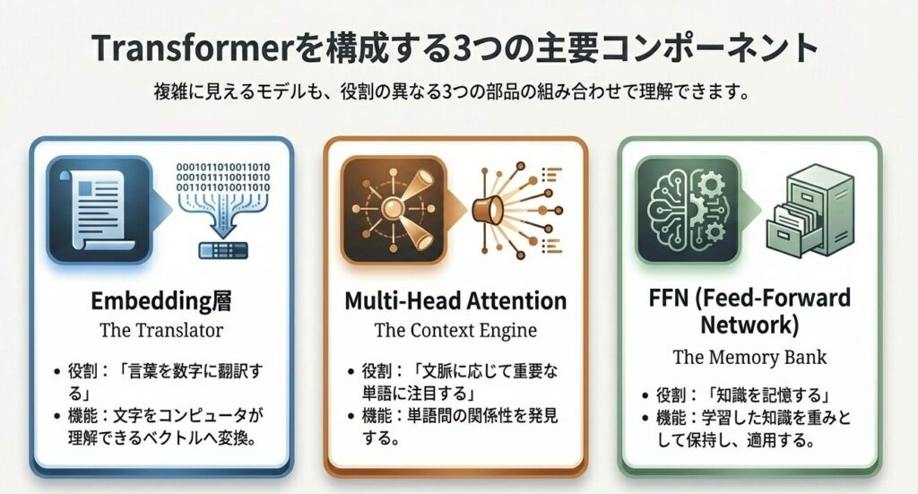 Transformerモデル構造の全体像:3つの主要コンポーネント