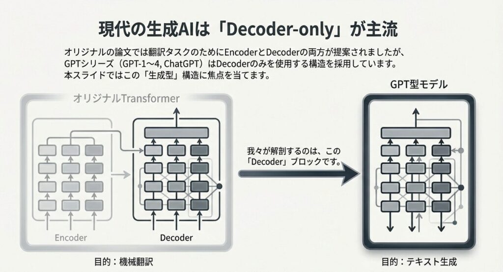 このブログの後続セクションでは、主に Decoder-only型(つまりGPT型)の構造を詳しく解説します。