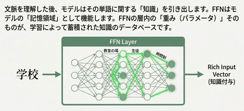 「学校」という単語を見た時、モデルは「学校 = 教育の場、複数の生徒がいる、時間割がある」というような知識を、層内の重みとして保持します。これが「モデルの知識」です。