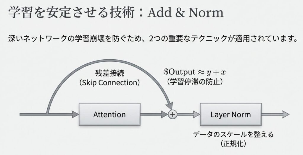 深いニューラルネットワークを学習させると、「勾配消失」や「学習の不安定化」といった問題が生じます。これを解決するために、Transformerでは2つの重要なテクニックが採用されています。