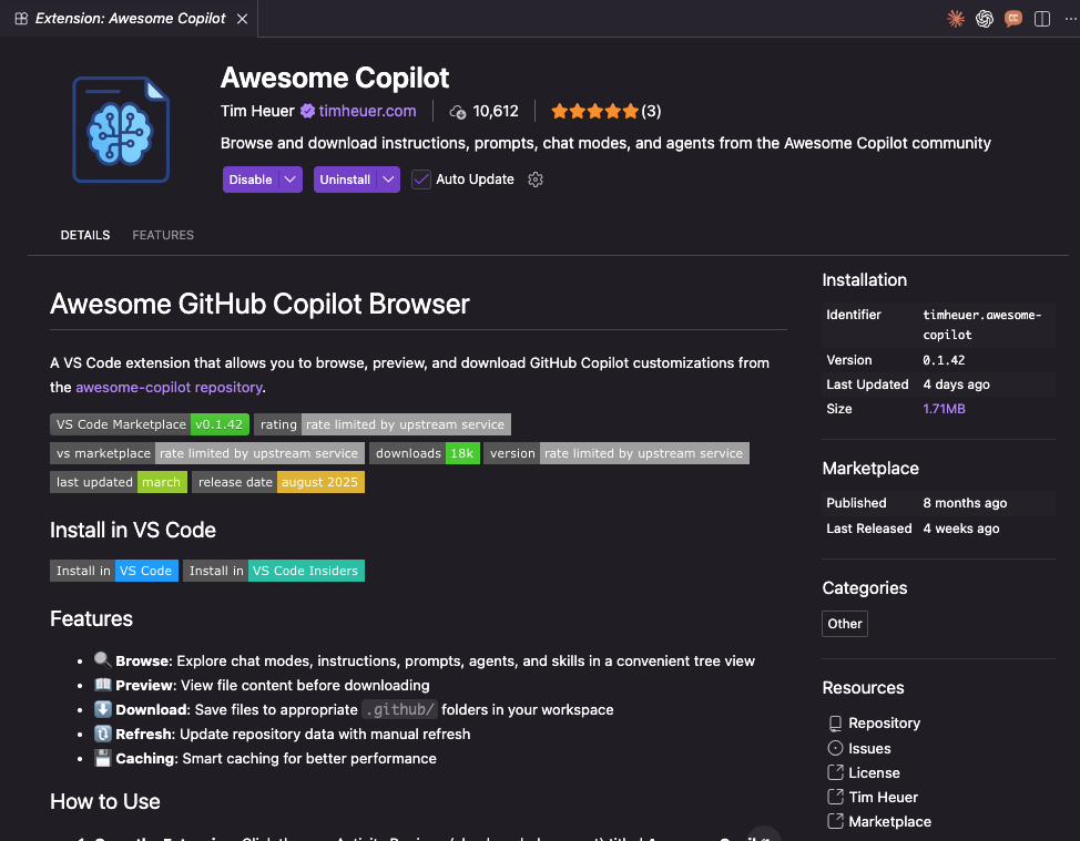 awesome-copilot の価値は、リソースそのものだけではありません。VS Code 拡張機能を使うと、探索、Preview、導入、管理までの friction が大きく下がります。中級エンジニアにとってここはかなり重要です。なぜなら、設定は一度入れて終わりではなく、日々少しずつ育てるものだからです。