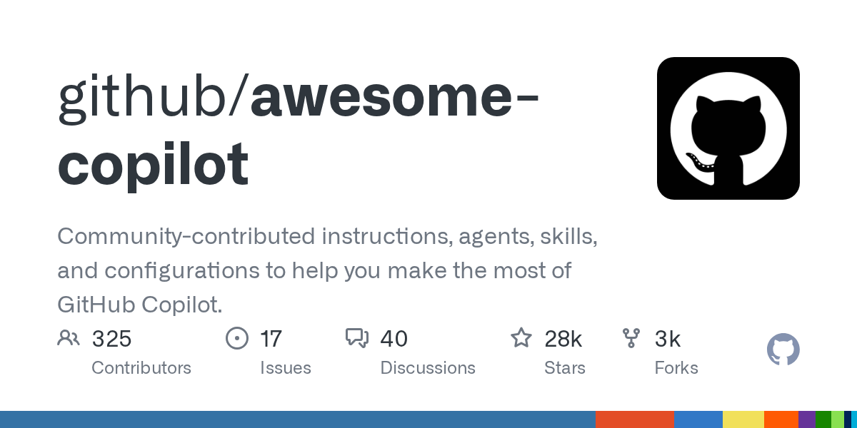awesome-copilot は、GitHub org 上で公開されているコミュニティ主導の GitHub Copilot カスタマイズ集です。公式 README では、Agents、Instructions、Skills、Plugins、Hooks、Workflows、Tools といったカテゴリが整理されており、単なるテンプレート置き場ではなく、Copilot 活用を拡張するための総合カタログとして設計されています。
