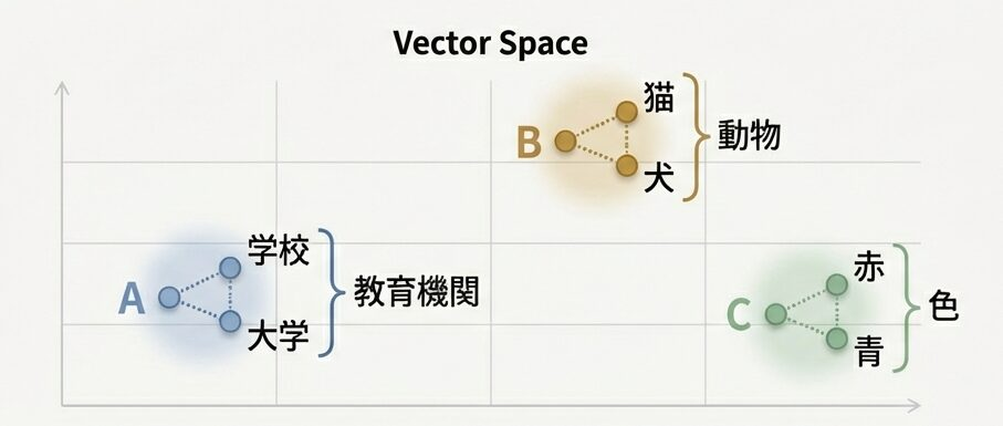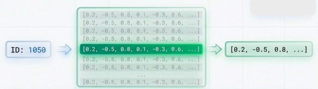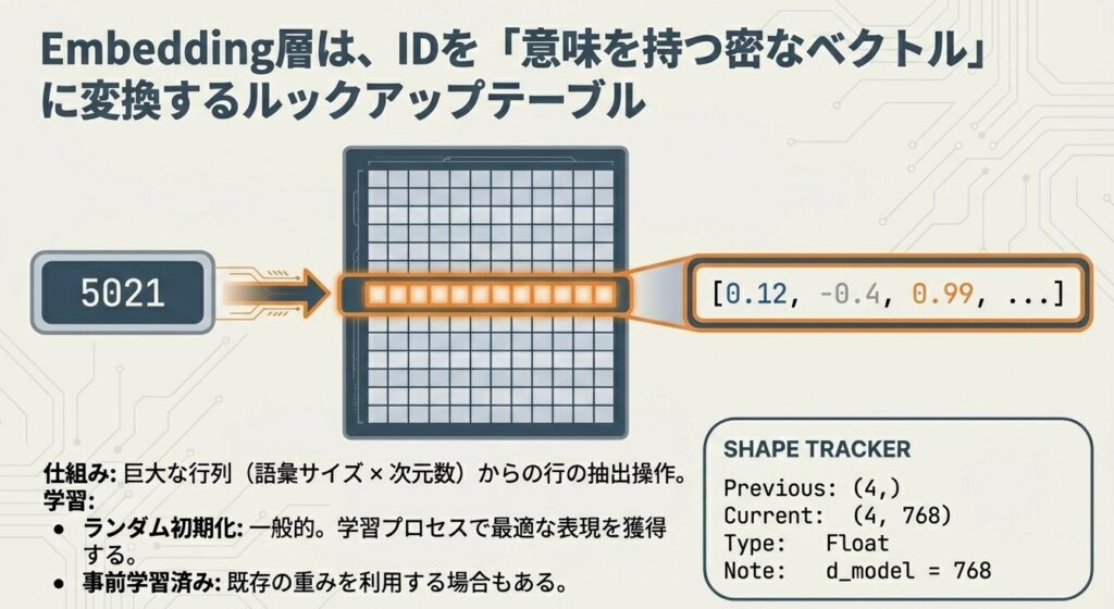 各トークンIDを、学習可能な数値ベクトルに変換します。学習を通じて、意味的に似た単語は近い位置に配置されます。