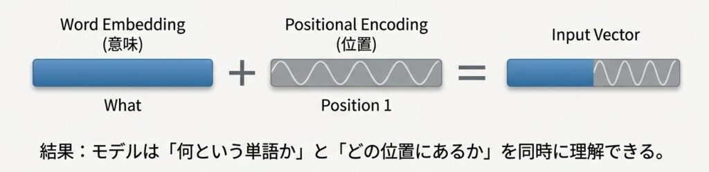 Transformerは各トークンを「同時に」処理するため、トークンの順序情報 をモデルに明示的に与える必要があります。