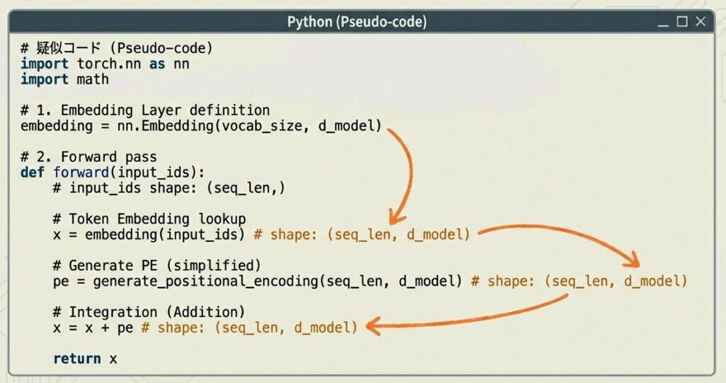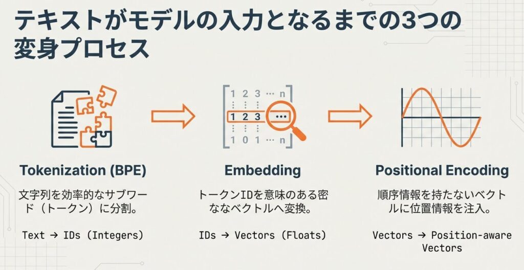 - 統合:トークン埋め込みと位置エンコーディングを加算し、最終的な入力表現