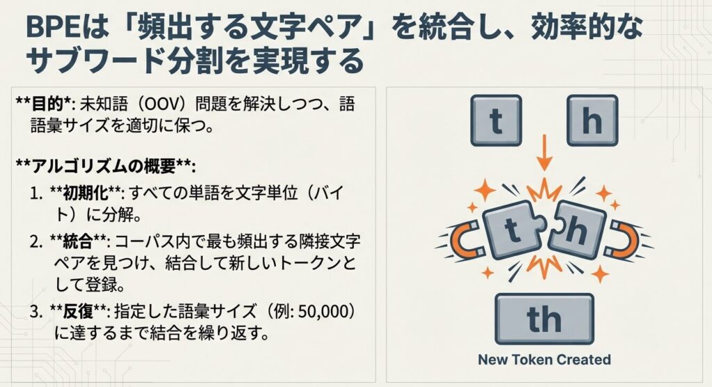 BPEは、テキストを適切なサイズのトークンに分割するアルゴリズムです。