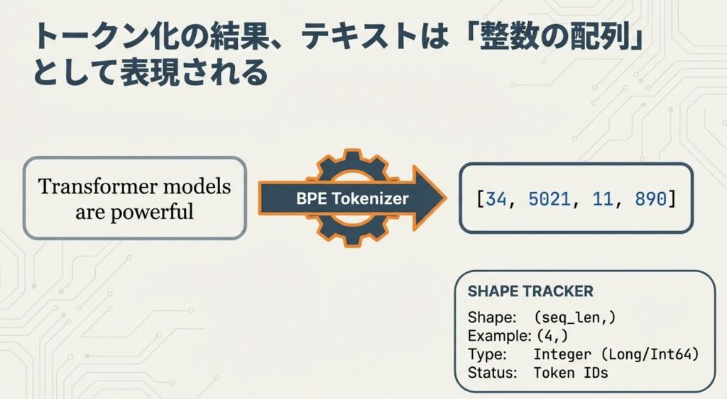 Embedding層と入出力形状の追跡:BPEからベクトル化まで