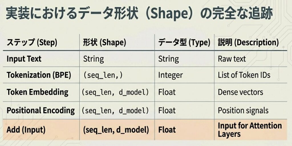 | Token Embedding | トークンID → ベクトル | (seq_len, d_model) |