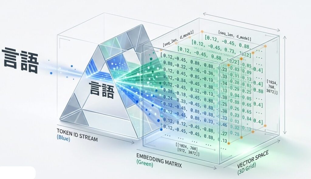 - トークン ID → ベクトル変換:語彙内の各トークンを固定次元のベクトル(d_model)に変換
