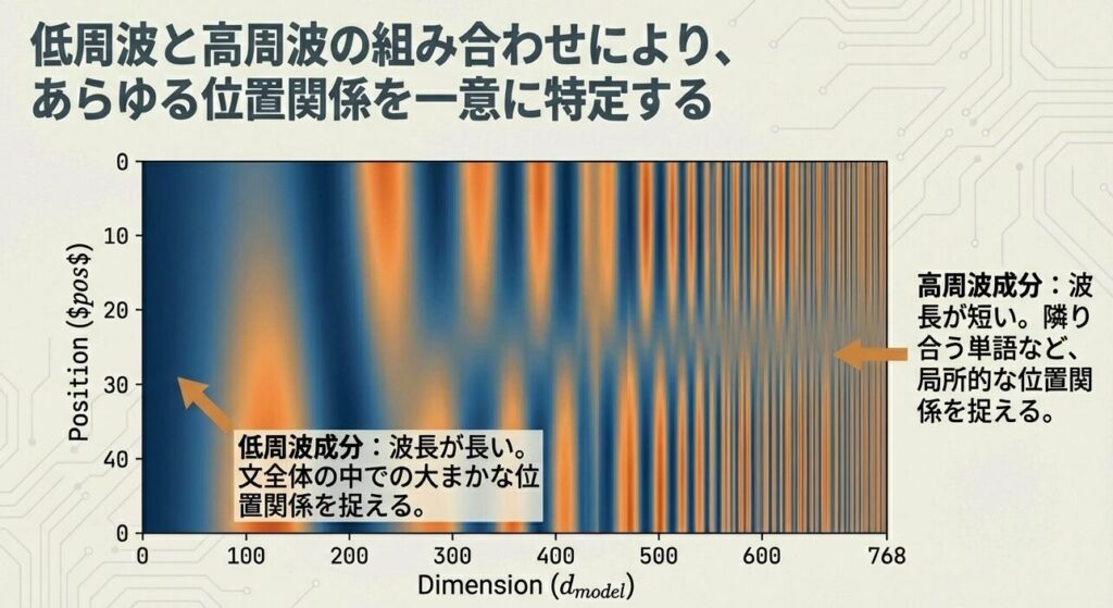 - 高周波成分(次元600-768):位置の細かい変化を捉える