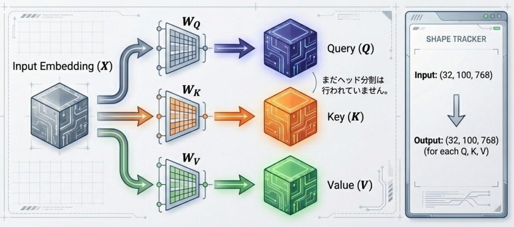 | 線形変換 | W_Q, W_K, W_V | (batch, seq, d_model) |