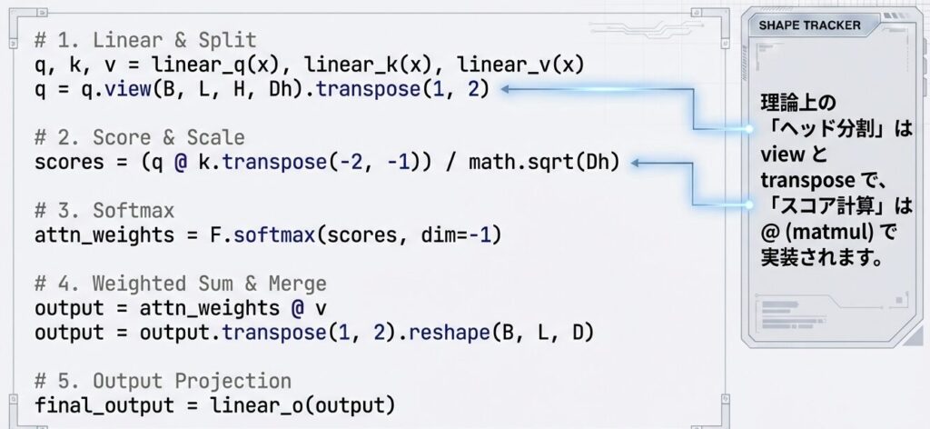 | ヘッド分割 | reshape + transpose | (batch, heads, seq, d_h) |
