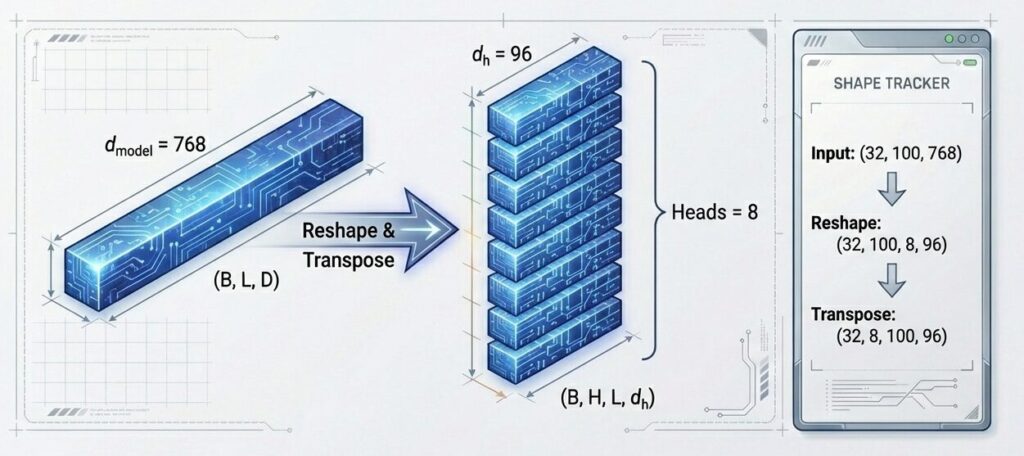 モデル次元(768)をヘッド数(8)で分割し、ヘッド次元(96)を持つ独立した部分空間を作成します。これにより、8つの独立した「脳」がシーケンスの異なる特徴に同時に注目できるようになります。