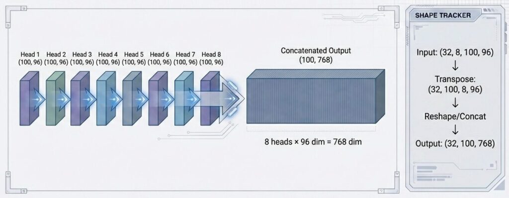 8つのヘッドの出力を連結(Concat)し、元のモデル次元d_model (768)の形状に戻します。