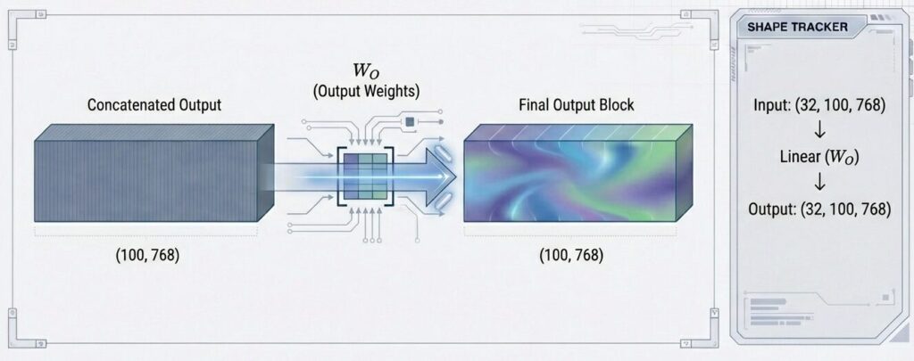 連結されたベクトルに、学習可能な重み行列W。を掛けます。これにより、別々のヘッドで収集された情報が相互に混合・統合され、次の層へ渡されます。