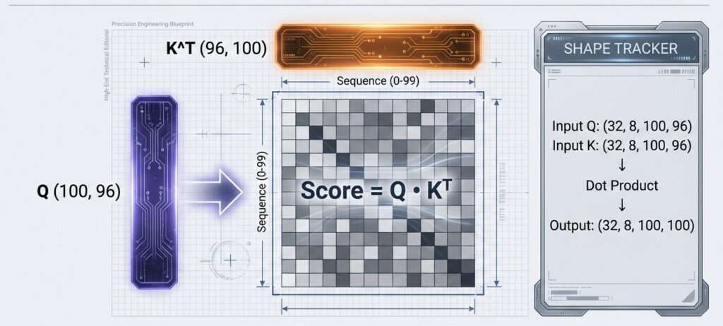 Queryと転置したKeyの内積をとります。これは「100個のトークンx100個のトークン」の関連度を表すマトリクスです。結果の形状の末尾が(100,100)になることに注目。