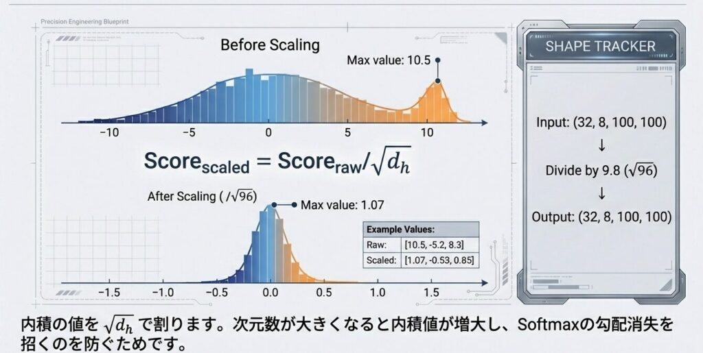 | スケーリング | / √d_h | (batch, heads, seq, seq) |
