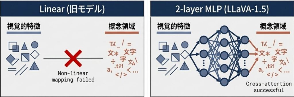 視覚的特徴とテキストの概念領域には複雑な対応関係が存在する。単純な線形(Linear)から非線形性を持つ2層MLPに変更することで、モダリティ間の深い相互理解(Cross-attention)が可能になった。