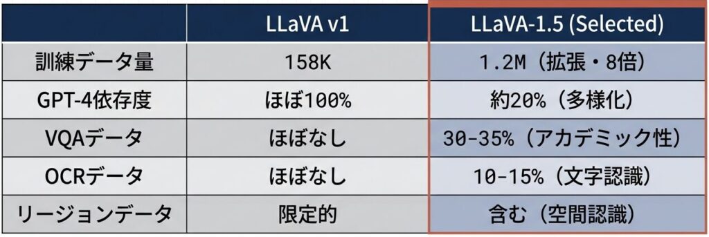 | 項目 | LLaVA v1 | LLaVA-1.5 | 意義 |