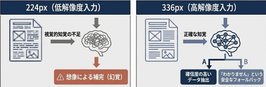 モデルは視覚情報が不足すると、訓練データのパターンから見えない部分を想像で補う。336pxへの入力解像度向上は、モデルに正確に「見る」能力を与え、信頼性の低い推測を根本から排除する。