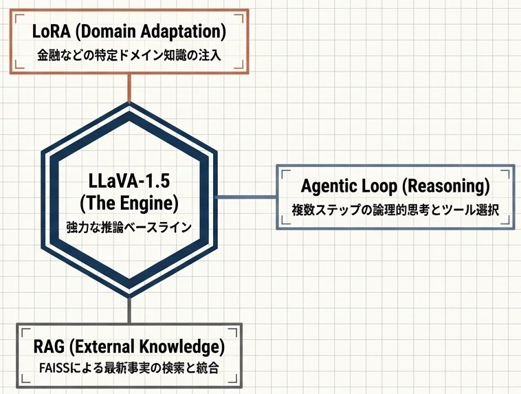 LLaVA-1.5単体では実世界の複雑な業務要件を満たせない。本プロジェクトは、このSoTAモデルを論エンジンとして中心に据え、LORA、Agent、RAGの3風情道で包み込むことで、本番帯物可能なシステム(The Vehicle)を構する