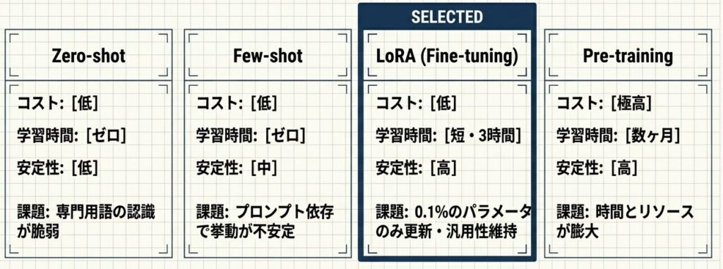 合成データ(Synthetic Data)を活用し、希少ケース(赤字データ等)を意図的に生成。LORAを用いて全パラメータのわずか0.1%を微調整することで、ベースモデルの汎用性を破壊せずに金融特化型の精度を低コストで獲得する。