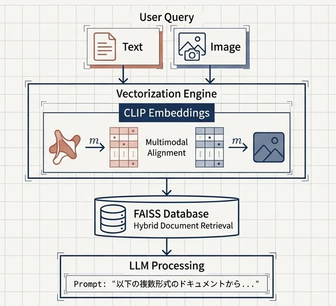画像固有の文脈消失を防ぐため、通常のテキストエンベディングではなくCLIP埋め込みを採用。視覚と言話を同一ベクトル空関(Multimodal Alignment)に整列させることで、画像クエリとテキスト文蔵のシームレスな相互果を実現する