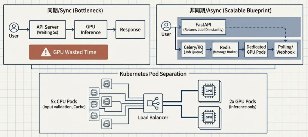 CPU側(入力検証、ロギング)とGPU側(モデル推論)のマイクロサービスを完全分離。非同期処理キュー(Celery+Redis)パッチング(4-bit子化)の導入により、GPUをゼロに抑え、インフラコストを月間$5,000から$1,200へと76%削減