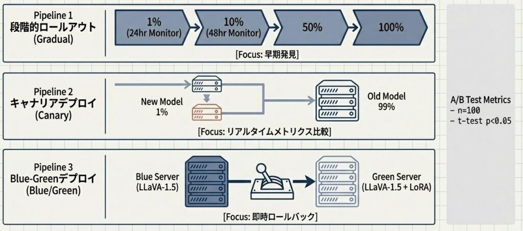 新モデル(LORA適用版)のリリースは統計的有意性(検定p<0.05)の確認後に行う。トラフィック性質とSLA要件に応じ、段階的ロールアウト、キャナリア、Blue-Greenデプロイを使い分け、ユーザー影響を最小化する。