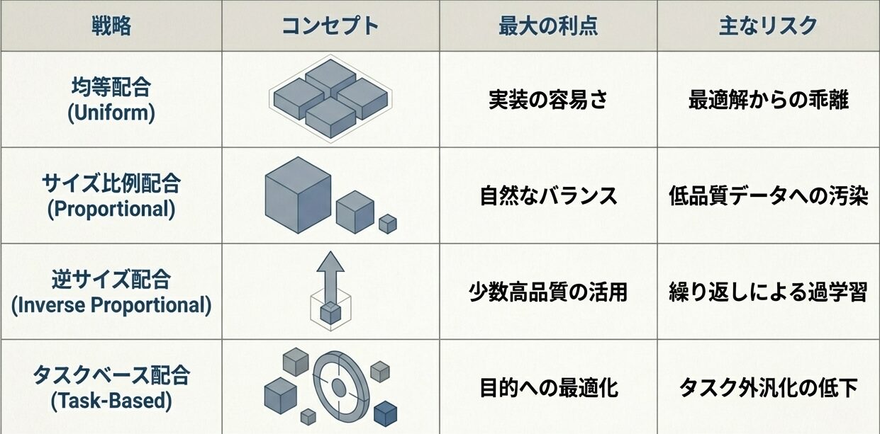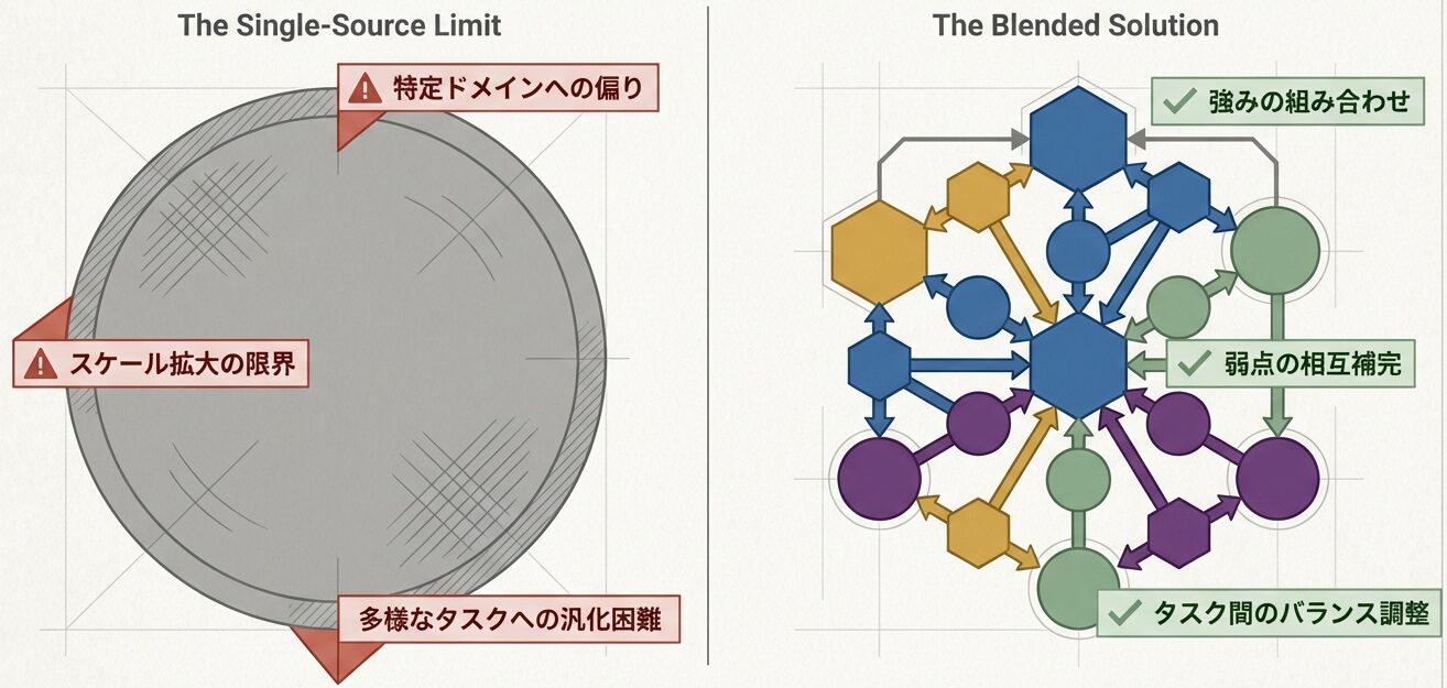 1つのデータセットだけで、あらゆるタスクに強いモデルを作るのは難しくなってきました。そこで重要になるのが、複数ソースをどう組み合わせるかです。