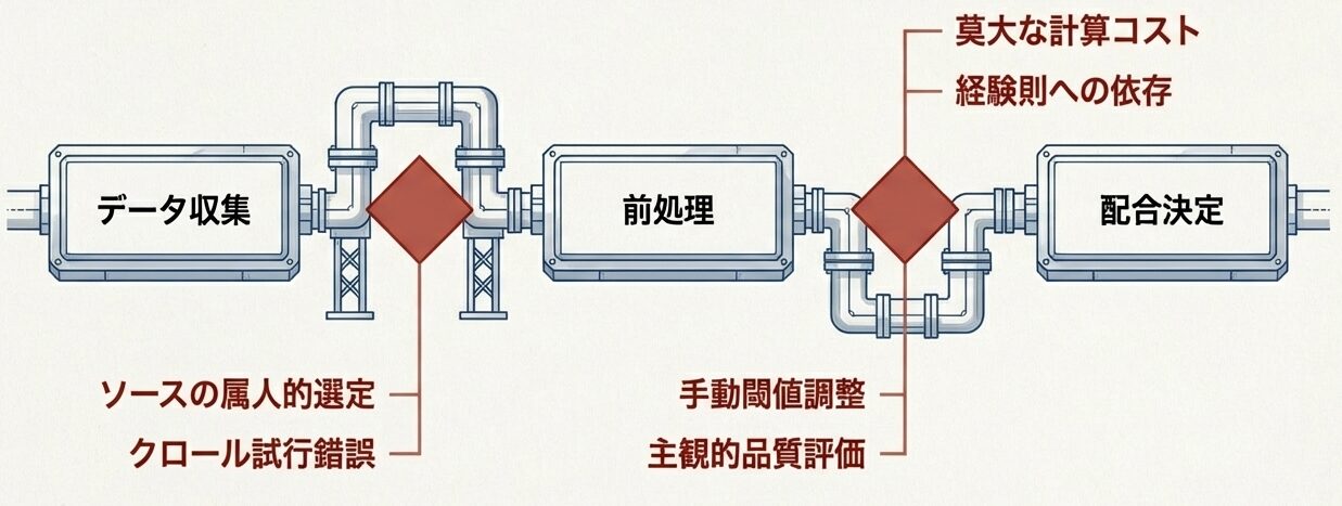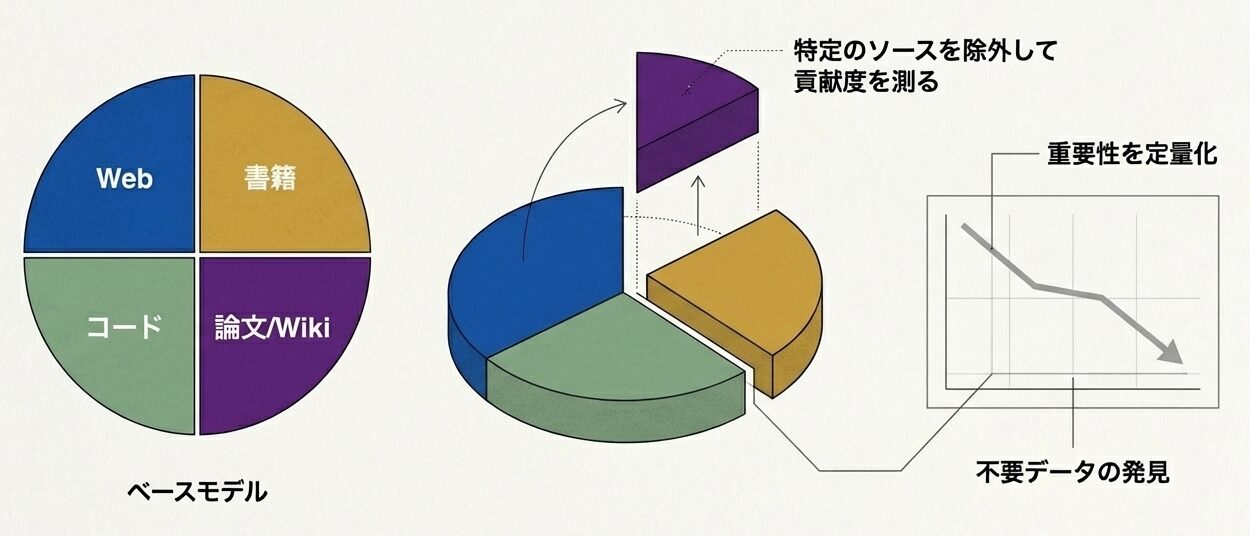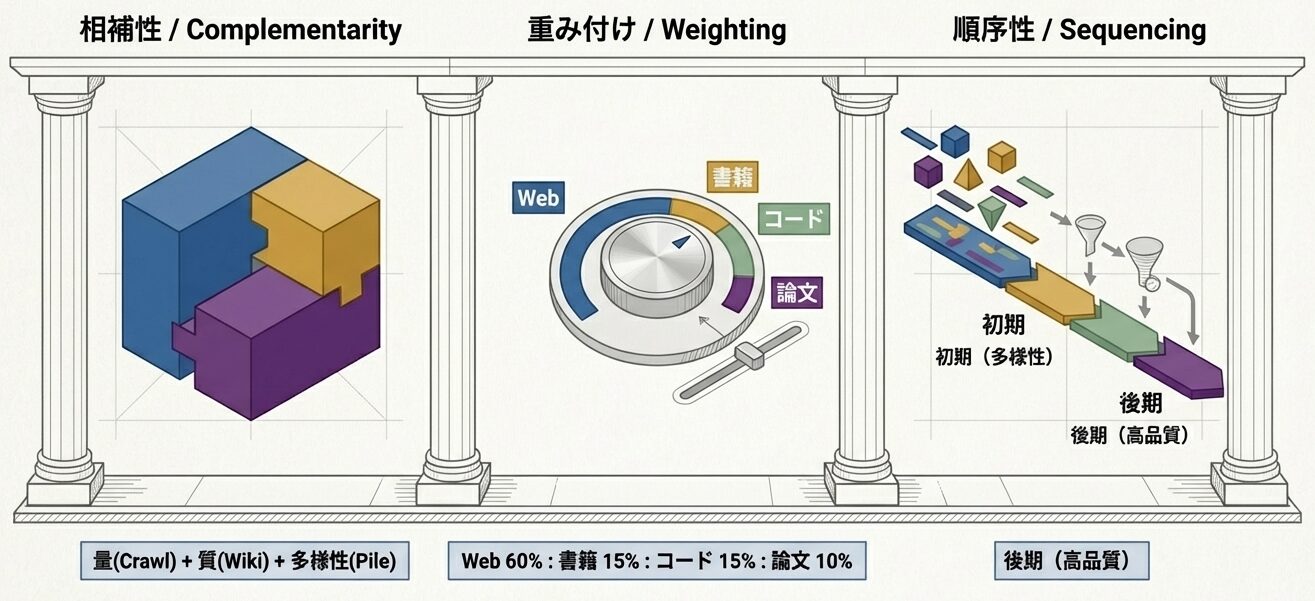 - 例: 量(Common Crawl)+ 質(Wikipedia)+ 多様性(The Pile)