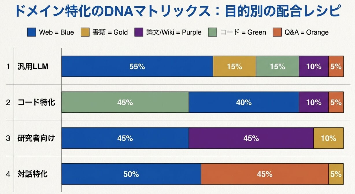 - 例: Web 60% + 書籍 15% + コード 15% + 論文 10%