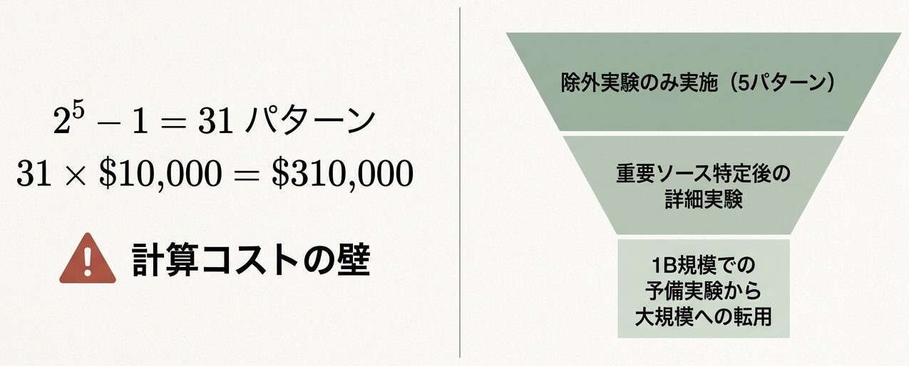 - 特定の要素、ここではデータソースを除外して、その貢献度を測る実験