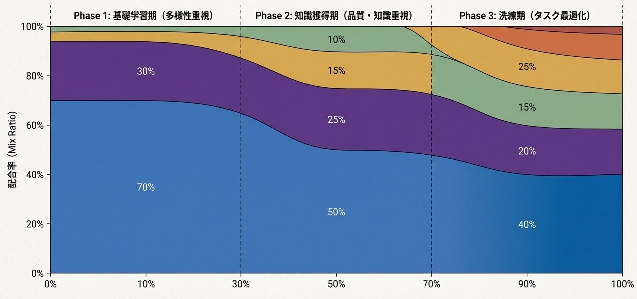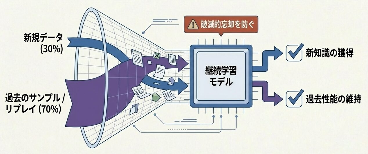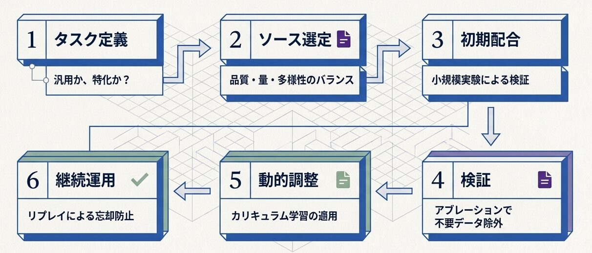 ブレンディングは、事前学習だけの話ではありません。継続学習まで含めると、データ配合の考え方はさらに重要になります。