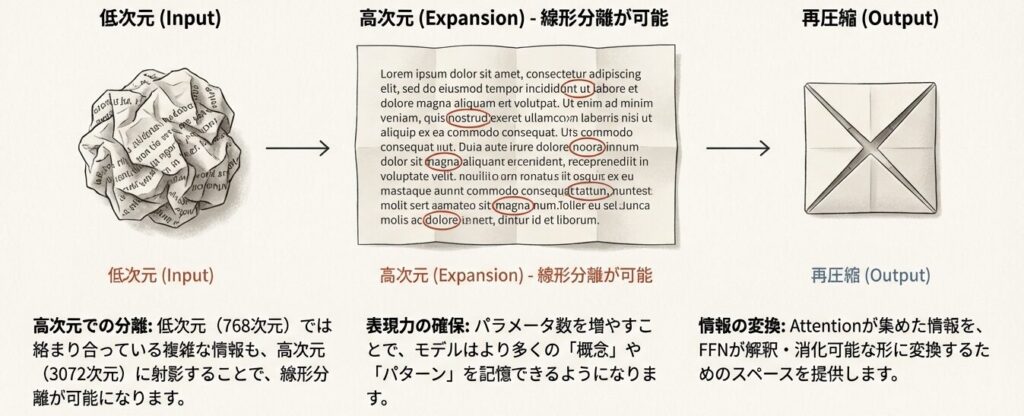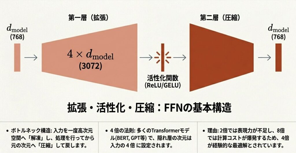 FFNは「拡張 → 活性化 → 圧縮」という3ステップで構成されます。
