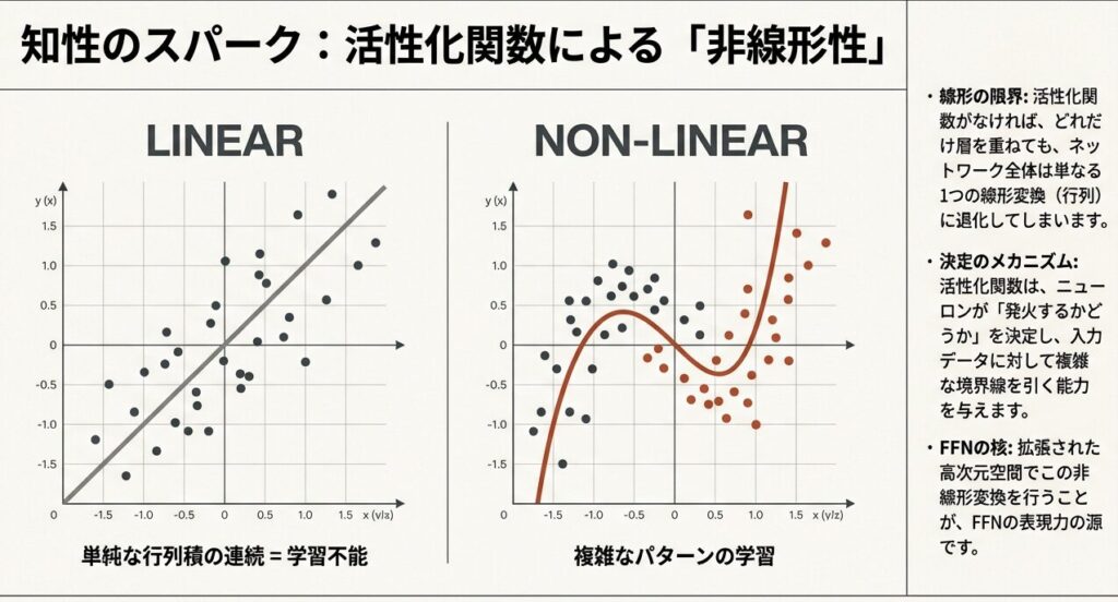 FFNに活性化関数が必要なのは、線形変換のみだと合成しても線形のままで表現力が不足するため。非線形性を導入することで複雑な関数を学習し、特徴抽出や出力の選択性・勾配の性質(滑らかさや安定性)を改善します。