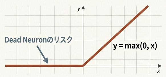 - Dead ReLU問題:負の値で勾配が0