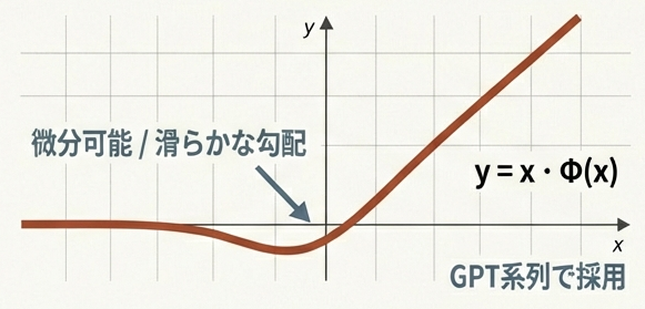 GELUは0付近で滑らかに変化し、小さな負の値を許容するため、勾配消失を防ぎ、より安定した学習が可能です。但し現在のLLMモデル(2026年1月)ではSwiGLUが主流として用いられています。