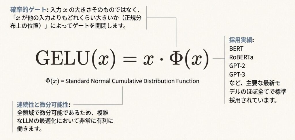 GELU(x) = x × Φ(x)は、入力xに標準正規分布の累積分布関数を乗じた活性化関数で、ReLUより滑らかでLLMの標準です。