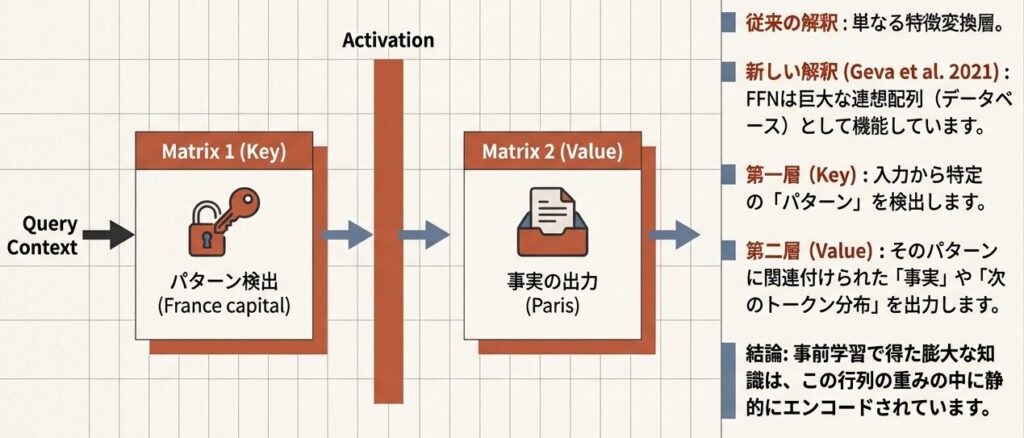 つまり、FFNの巨大なパラメータ空間こそが、AIが世界を記述するための「記憶」そのものです。