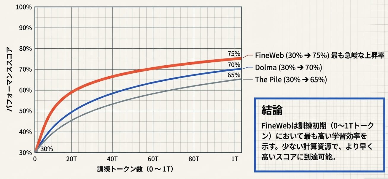 この比較から、FineWebで学習したモデルは訓練初期から一貫して高いスコアを出しやすく、学習効率が高いと読み取れます。