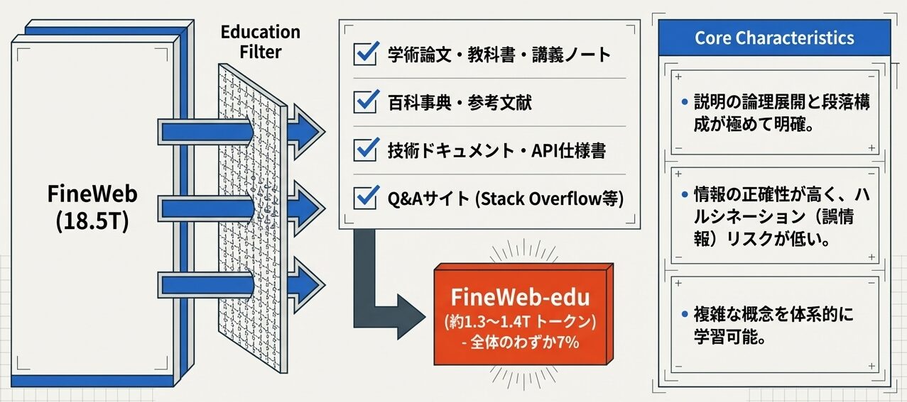 - ソース: FineWebの全18.5Tトークンから、教育的・学術的なテキストを抽出している