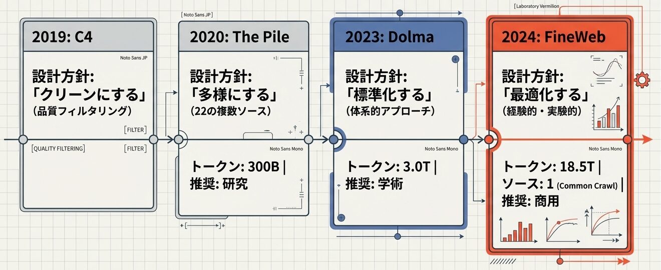 FineWebを単体で見るより、C4やThe Pile、Dolmaの流れの中に置くと役割がはっきりします。各世代が何を最優先にしていたかを見ると、設計の変化が追いやすくなります。