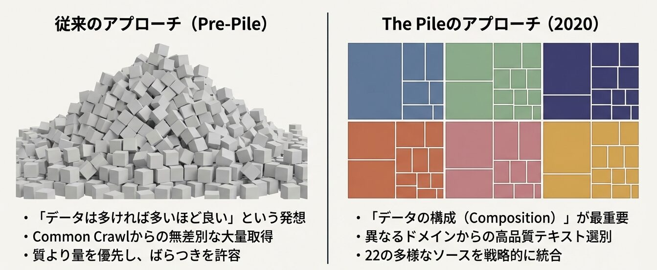 The Pileが出てきた背景には、「大きいデータを集めれば十分」という考え方への見直しがあります。ここでは、その違いをはっきりさせておきます。