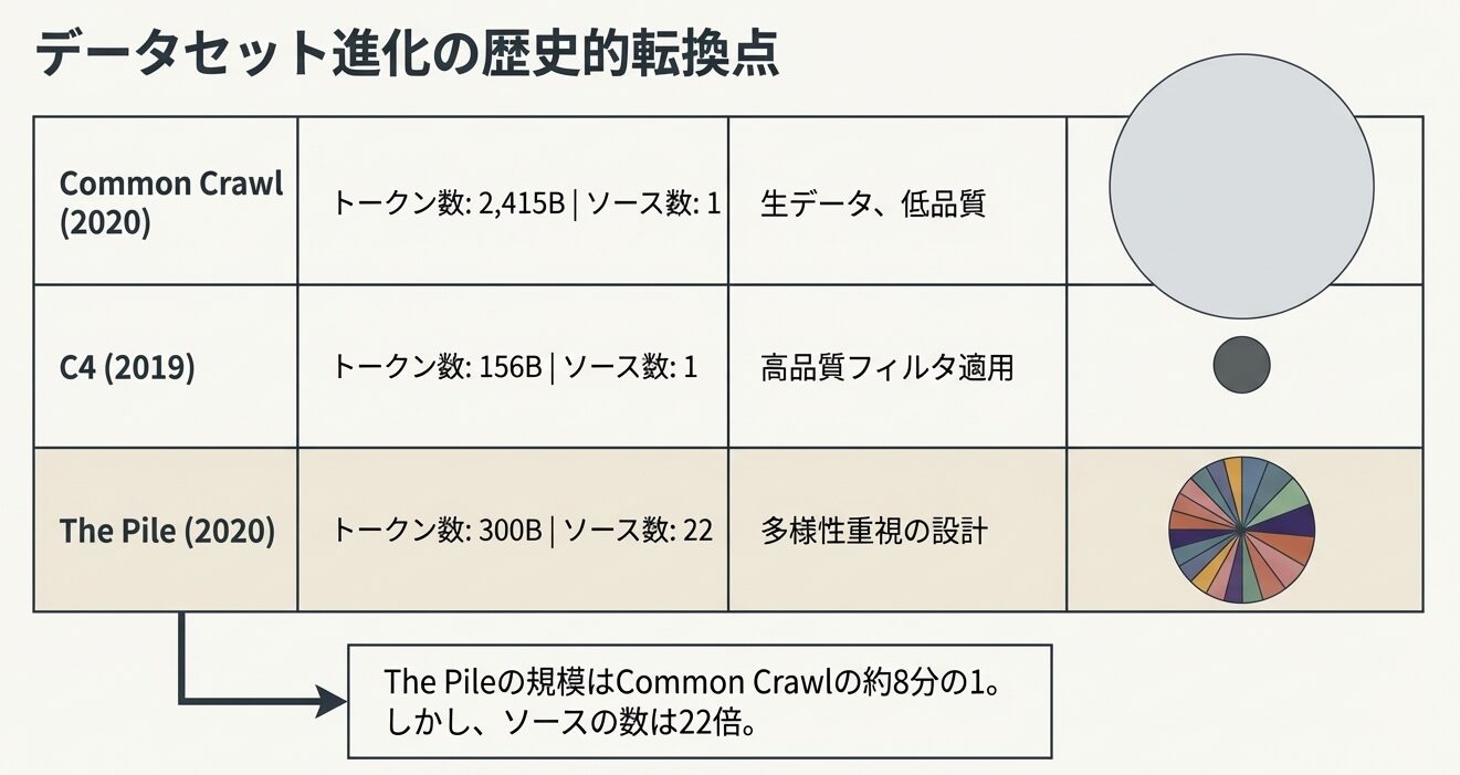 The Pileの登場で、データセット設計の話は「どうやって大量に集めるか」から「どういう構成で学ばせるか」へ少しずつ移っていきました。