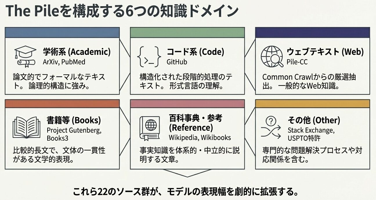 The Pileの価値は、単にソース数が多いことではありません。異なる種類の文章を混ぜることで、モデルが学習できる表現の幅そのものを広げた点にあります。