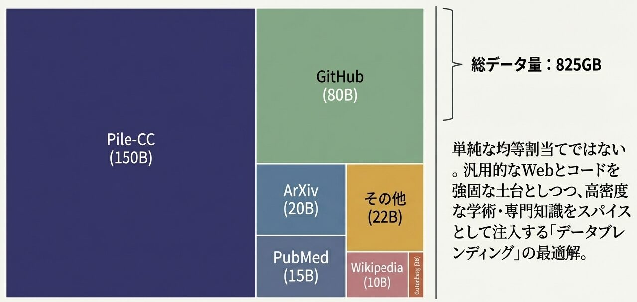 2020年、EleutherAIが公開したThe Pileは、LLMデータセット設計の見方を少し変えました。単に量を増やすのではなく、どんな種類のテキストをどう混ぜるかが重要だと示したデータセットです。
