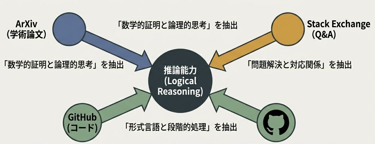 • たとえば「推論」は、数学論文、プログラミング、法律文書で少しずつ違う形で現れる